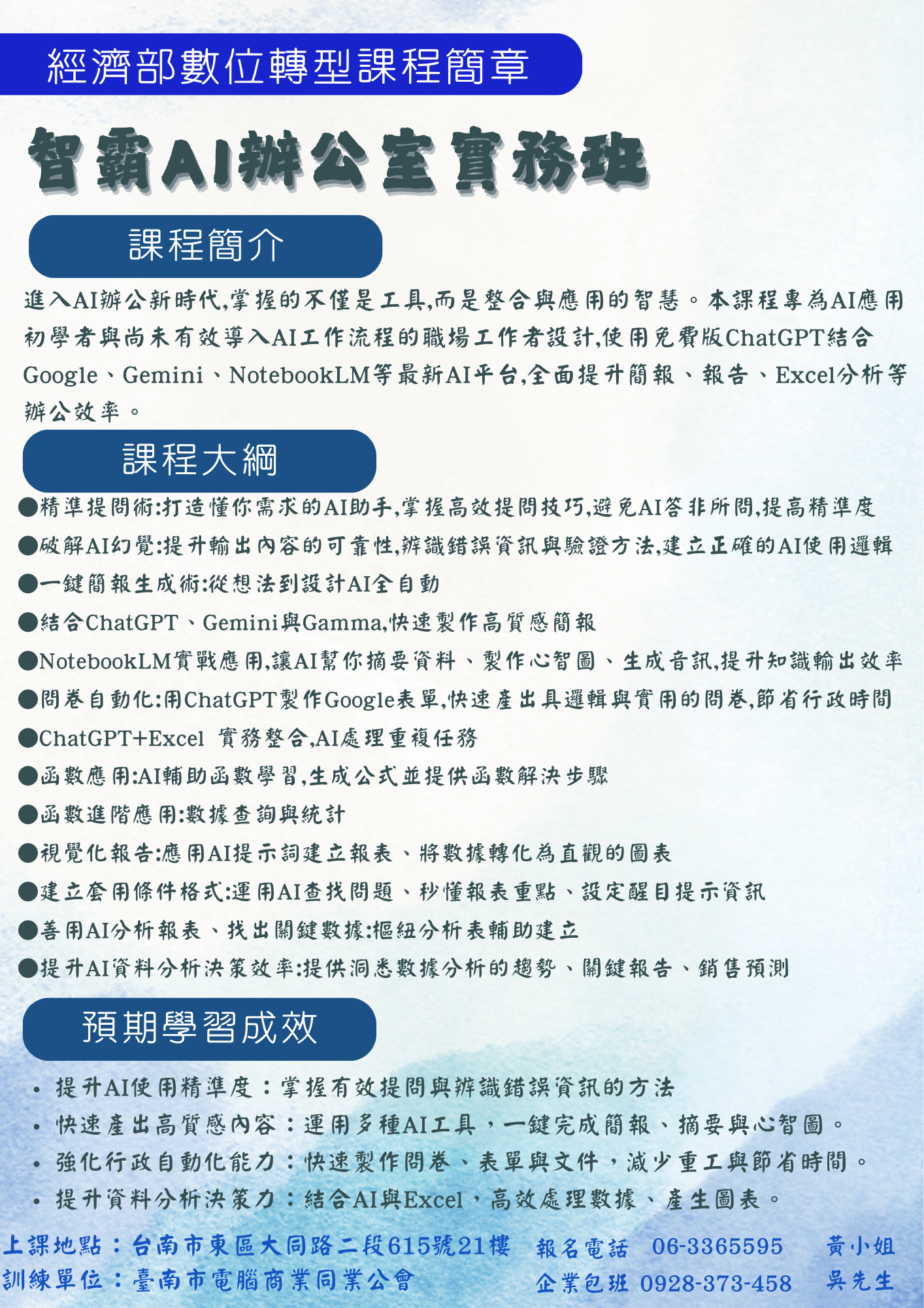 課程報名/諮詢:06-3365595 黃小姐