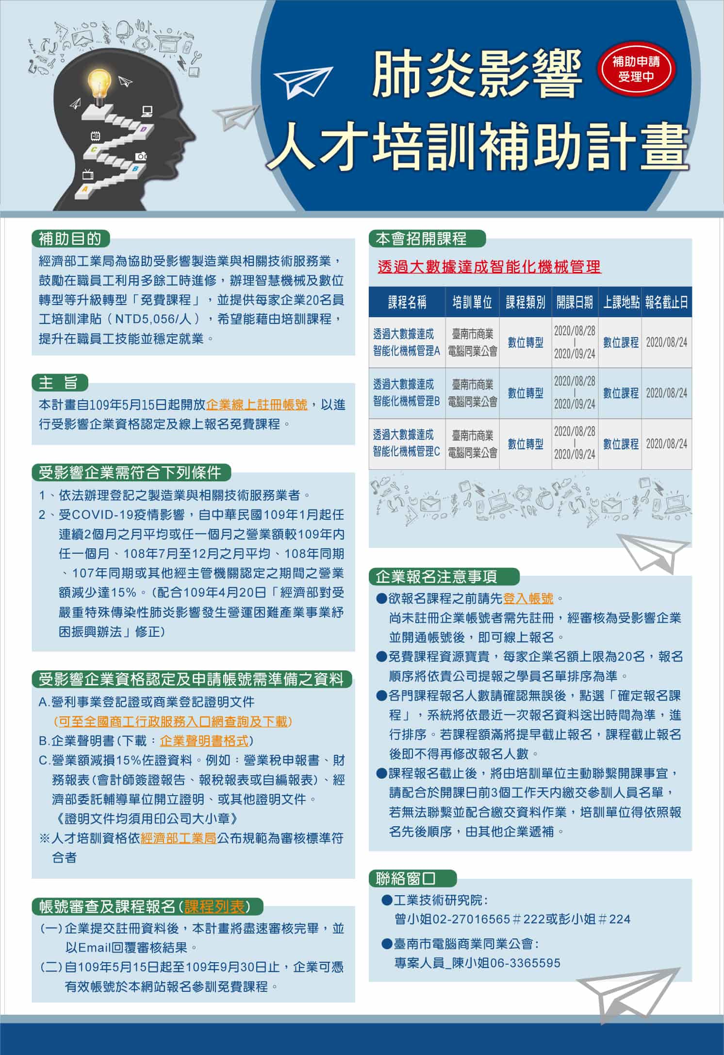 經濟部工業局為協助受影響製造業與相關技術服務業,鼓勵在職員工利用多餘工時進修,辦理智慧機械及數位轉型等升級轉型「免費課程」,並提供每家企業20名員工培訓津貼(NTD5,056 / 人),希望能藉由培訓課程,提升在職員工技能並穩定就業。