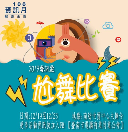 「2019資訊盃尬舞大賽」,是今年資訊月特別針對年輕族群規劃活動,希望大家享受科技同時,更重視健康與運動,此外也提供年輕人一個表演舞台空間,讓參賽者有表現機會及相互交流學習。首次舉辦希望大家一起來互相切磋、共襄盛舉,拚冠軍拿豐厚獎金!!