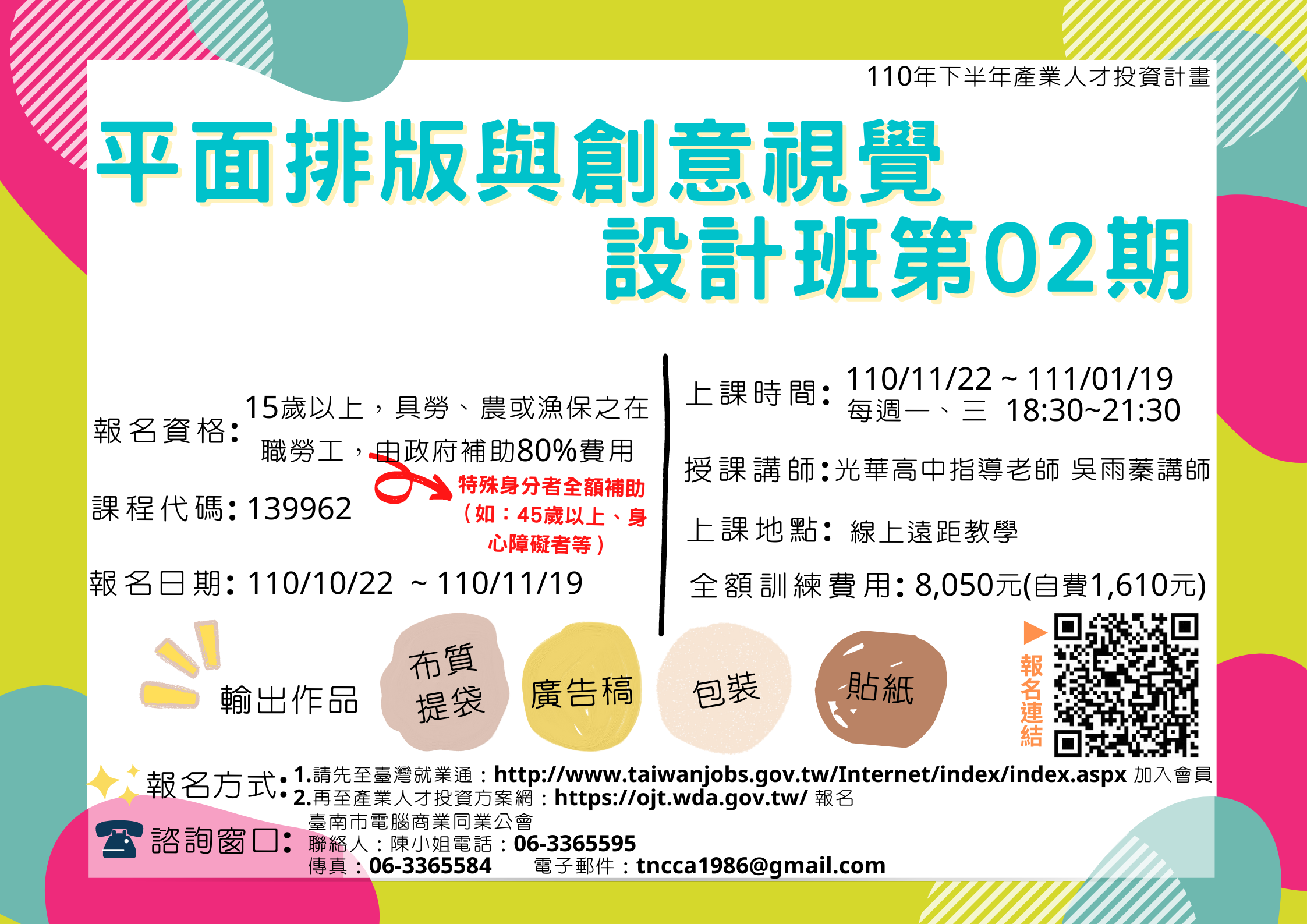 8堂課程帶您學會從產品設計到包裝,有作品輸出:提袋、自製廣告稿、包裝設計、貼紙,非常超值的熱門課程!!補助名額有限,請盡速線上完成報名,以免影響權益~