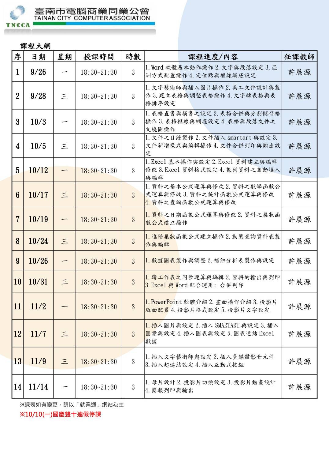 ►上課日期:111/09/26 ~ 111/11/14 每週一、三 18:30~21:30