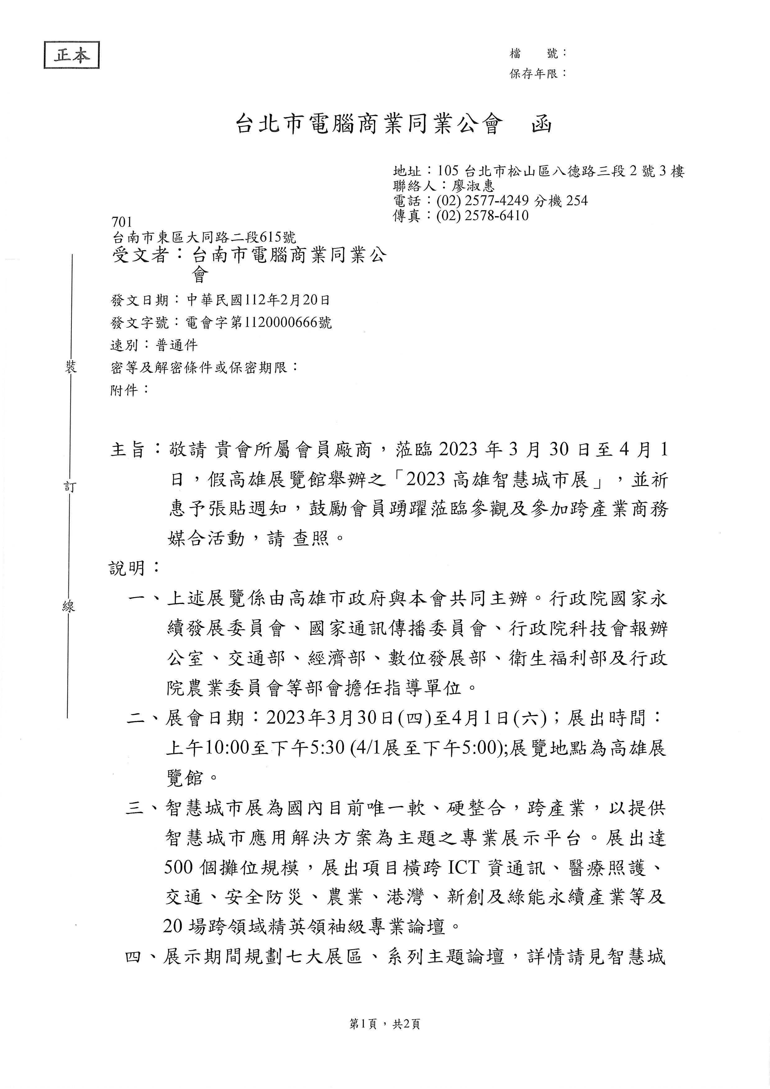 主旨:敬請 貴會所屬會員廠商,蒞2023年3月30日至4月1日,假高雄展覽館舉辦之「2023高雄智慧城市展」,並祈惠予張貼週知,鼓勵會員踴躍蒞臨參觀及參加跨產業商媒合活動,請 查照。